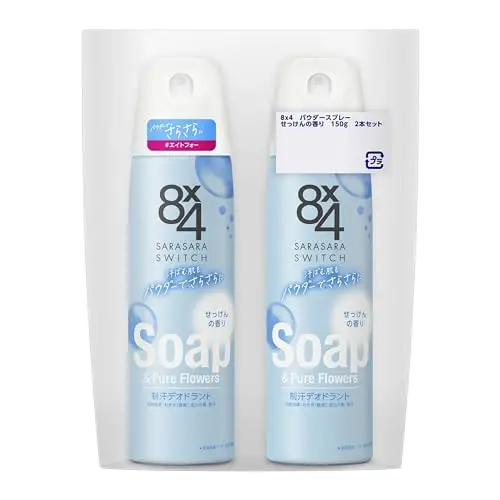 エイトフォーのパウダースプレー、せっけんの香りの2本セットです。制汗剤ランキングで上位の人気商品です。使用時は肌から10cm以上離してスプレーしてください。