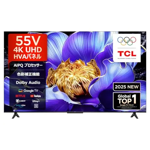 【Amazon.co.jp限定】TCL 55V6Cは、4Kの美しさをAIで極めた2025年モデルです。 AiPQプロセッサが画質をピクセルレベルで調整し、鮮やかな映像を実現。