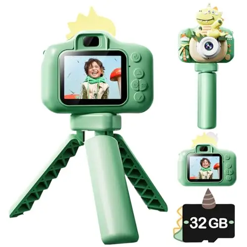 キッズカメラ 子供用カメラ おもちゃ Skifry 三脚付 トイカメラ 4800w画素 1080P HD動画 自撮り最適 タイマー撮影 32GB TFカード シリコン保護ケース ストラップ付属 音楽プレーヤー ゲーム機能 デジタルカメラ USB充電式 男の子 女の子 子供の日 誕生日プレゼンド 日本語説明書付き(三脚付き・恐竜デザイン)