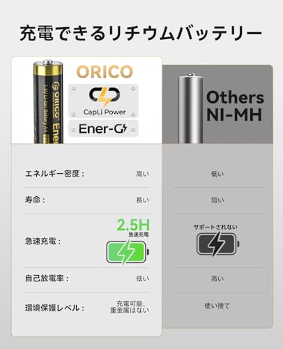 ORICO Ener-G 単3リチウム充電電池は、1.5Vの定常出力を保ち続ける高容量2300mWhの充電池です。