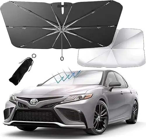 【2025最新スタイル】サンシェード 車用フロントブロック 車用サンシェード 折りたたみ傘タイプ 10本骨 湾曲傘柄 車用サンシェード 軽量 車用日よけ 断熱 紫外線防止 車中泊 仮眠保護 プライバシー保護 簡単取付 収納便利 (約135/140×74cm)
