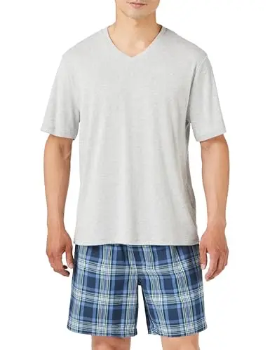 [Amazon Essentials] パジャマ セット Tシャツ・ポプリン ショートパンツ メンズ ネイビー チェック柄/ヘザーグレー XS
