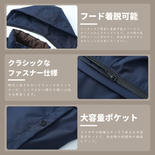 脱着式のフードとハイネックで、シーンに合わせた着こなしが可能。シンプルなデザインはオフィスカジュアルから日常使いまで幅広く活躍します。