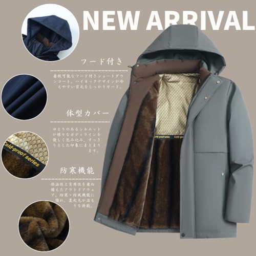 [Inkpoo] メンズ コート 冬服 ベンチコート ショートダウン フード付き 脱着式フード ハイネック 裏起毛 中綿入り 暖かい 保温 防風防寒 アウトドアウェア アウトドア カジュアル 体型カバー シンプル コーデ オフィス Gray L