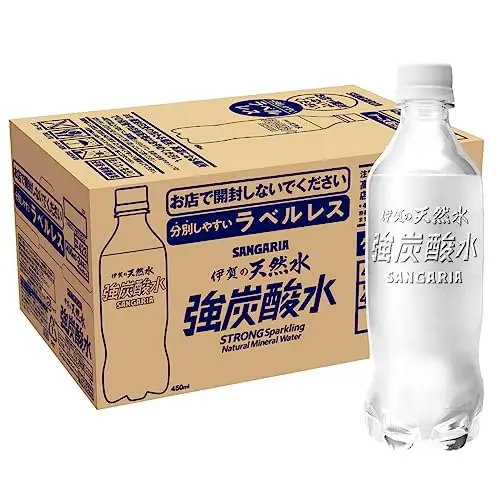 サンガリアの「伊賀の天然水 強炭酸水」がラベルレスで登場。450mlペットボトルが24本セットです。
