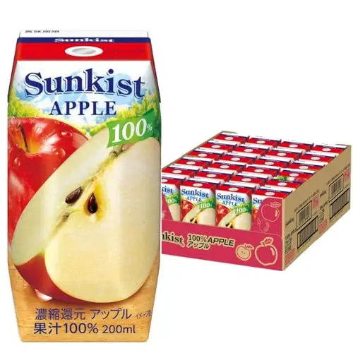 サンキストの100%アップルジュースは、果汁100%の本格的な味わいを手軽に楽しめる紙パックです。酸味と甘みのバランスが良く、飲み切りやすい200mlサイズ。常温保存が可能で、まとめ買いに最適です。紙パックはゴミ捨ても簡単で便利。原料のりんご果汁は中国またはチリ産を使用しています。