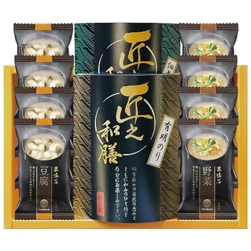 マルコメの「京懐石お味噌汁」フリーズドライと、有明海産の味付のり、ごま昆布の佃煮が一度に楽しめる詰合せです。