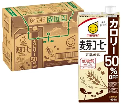 マルサンの豆乳飲料麦芽コーペーは、カロリー50%オフで1L×6本の大容量パックです。