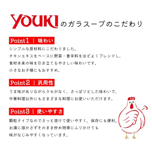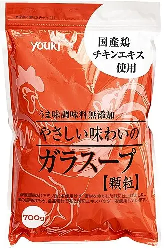 ユウキ食品の「やさしい味わいのガラスープ」は、スープにも炒め物にも使いやすい顆粒タイプです。素材の味を邪魔せずに旨みとコクをプラスします。