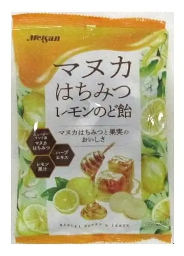 明治産業の「マヌカはちみつレモンのど飴」は、国産の砂糖と天然のはちみつをベースに、濃縮レモン果汁の爽やかな酸味を加えたのど飴です。
