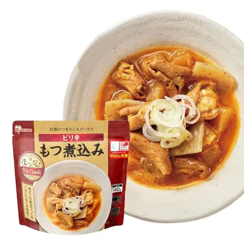 【ピリ辛もつ煮込み】お酒のつまみにもぴったり。米どころ新潟県魚沼でご飯に合う惣菜を作りました。レンジだけでこの旨さ。温めるだけかんたん一品。自立可能な容器をそのままレンジで簡単調理。満足できる食べ応えで、どんなシーンでも活躍。