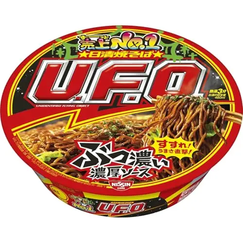 日清焼そばU.F.O.は、「うまいソース」「太い麺」「大きいキャベツ」が特徴のカップ焼そばです。濃厚ソースが香ばしく、食欲をそそります。具材には大切りキャベツと豚肉が入り、別添で青のりと紅生姜のふりかけも付属しています。小麦・乳成分・大豆・鶏肉・豚肉・りんご・ゼラチンを含むため、アレルギーに注意してください。1食128gのボリュームで、「ソースが食べたい!」そんな時にぴったりの一品です。詳細はパッケージをご覧ください。