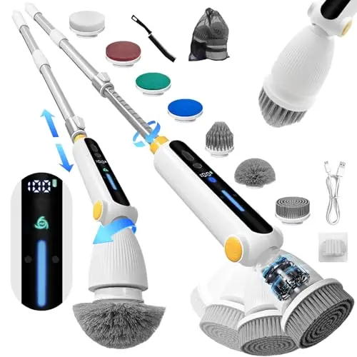 Packlyxバスポリッシャー コードレス 電動お掃除ブラシ 4段階の角度調整 8つ取り替えブラシ付き 11段階長さ伸縮可能 2つ回転モード お風呂掃除 ターボプロ ブラシ 軽量 手持ち式 IPX7完全防水 3600mAh大容量電池 4時間連続使用 Type-C充電式 操作便利 壁掛ホルダー 収納袋付き 日本語説明書付き トイレ掃除/床/窓/壁/浴槽/車/玄関/年末掃除 ギフト最適 ホワイト