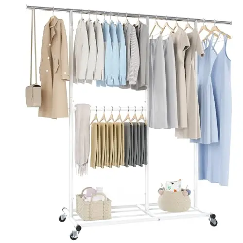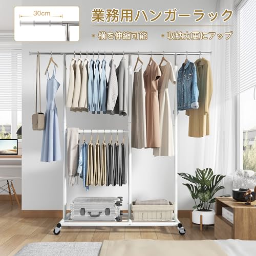 REIBII ハンガーラック 頑丈 パイプハンガー 大容量 幅115-175cm 耐荷重135KG 洋服ラック 収納ラック 洋服掛け 夏物約75着 冬物約45着 おしゃれ 組立簡単 縦横伸縮 物干し 衣類収納 棚付き キャスター付き 白い