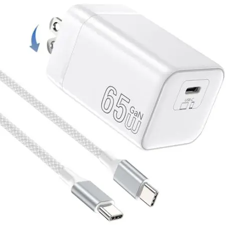PD 65W 急速充電器 type-c【GaN II採用】2M Type-C ケーブル付きタイプC 携帯充電器 1ポート スマホ充電器 最軽量/超小型 折りたたみ式プラグ 旅行に最適【PSE認証済/PD3.0/QC3.0/PPS対応】MacBok/MacBok Pro/Pad/For iPhone 17/16/15 Android ノートPC 各種の他USB-C/USB-A機器対応-ホワイト
